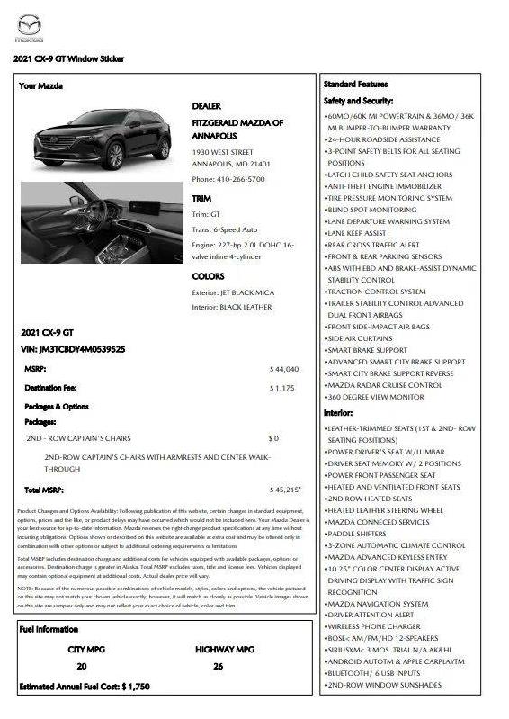 2021 MAZDA CX 9 JM3TCBDY1M0 Decoded Specifications